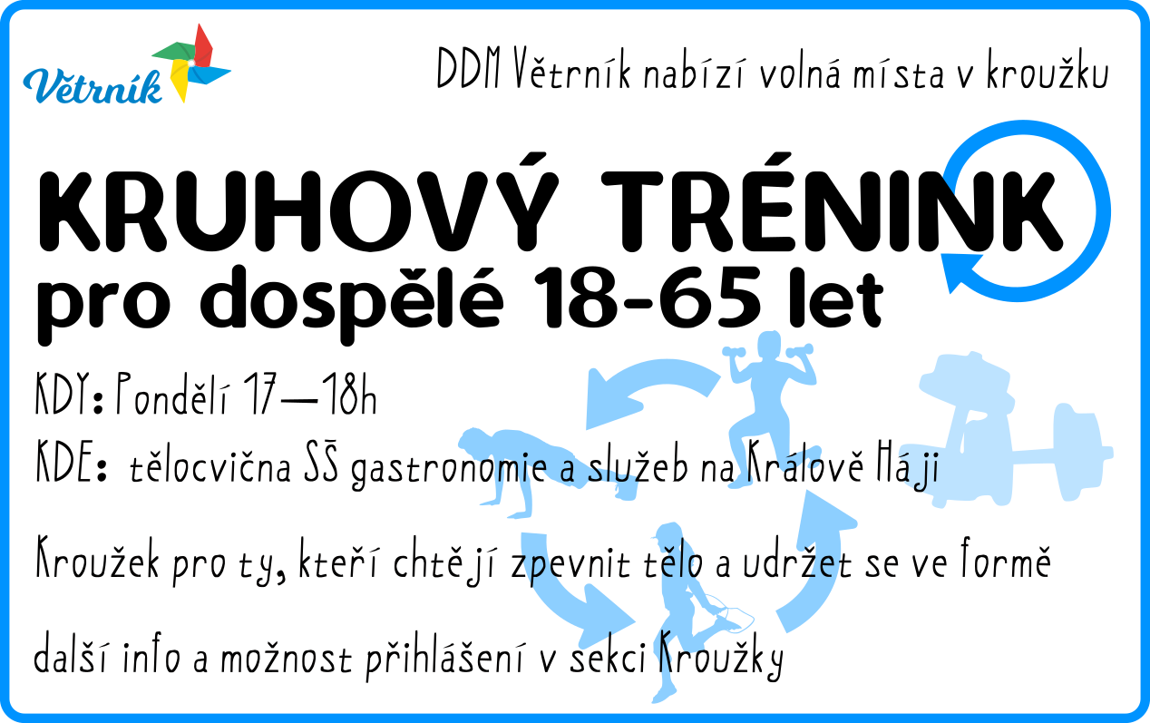 Nabízíme volná místa v kroužku Kruhový trénink III pro pány i dámy ve věkovém rozmezí 18-65 let, kteří chtějí zpevnit tělo a udržet se ve formě.