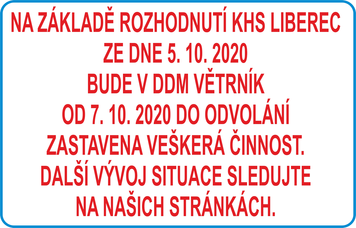 NA ZÁKLADĚ ROZHODNUTÍ KHS LIBEREC ZE DNE 5. 10. 2020 BUDE V DDM VĚTRNÍK OD 7. 10. 2020 DO ODVOLÁNÍ ZASTAVENA VEŠKERÁ ČINNOST. O PŘÍPADNÝCH ZMĚNÁCH BUDEME NA NAŠICH STRÁNKÁCH INFORMOVAT. DĚKUJEME ZA POCHOPENÍ.