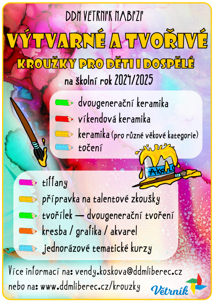 Pro více informací ke konkrétním kroužkům a kurzům mrkněte sem: https://www.ddmliberec.cz/krouzky?c=V%C3%BDtvarn%C3%A1+%C4%8Dinnost&a=&p=