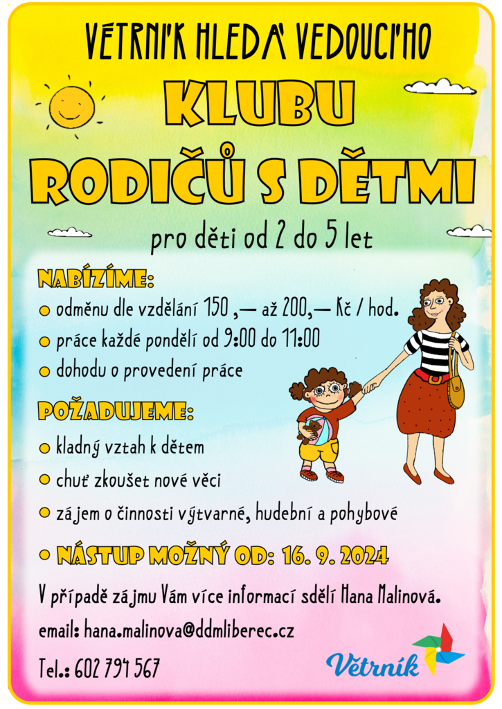 DDM VĚTRNÍK HLEDÁ VEDOUCÍ NA PONDĚLNÍ KLUB RODIČŮ S DĚTMI