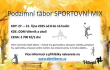 Ve dnech od 27. do 31. října 2025, od 8 do 16 hodin, otevíráme podzimní tábor SPORTOVNÍ MIX - míčové hry, gymnastika a akrosport, atletika, pohybové hry, opičí dráhy, cirkusové umění, tvoření, čas trávený venku a mnoho dalšího...