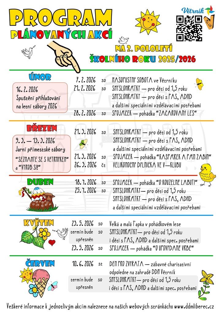 Máme radost, že se s Vámi opět můžeme podělit o program akcí na 2. pololetí školního roku 2025/2026. Inspirujte se a zapište si termíny. Těšíme se na společná setkání.