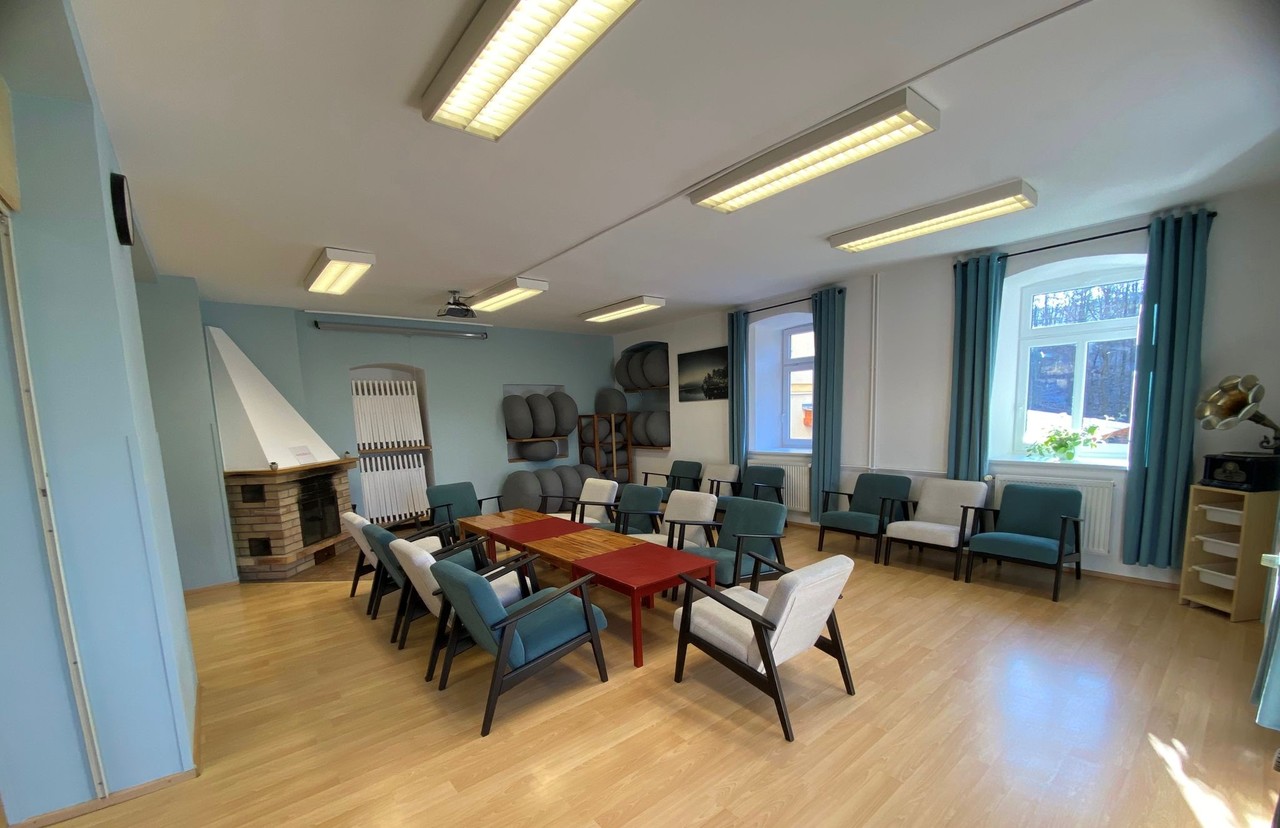 Hostům jsou k dispozici tři klubovny, jídelna, dvě kuchyňky a velká společenská místnost s krbem, kterou lze přepažit na dva menší prostory.