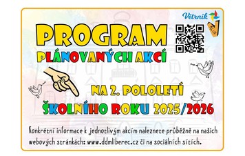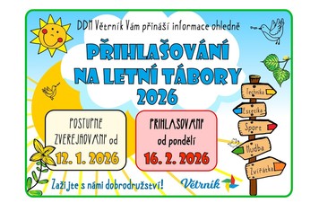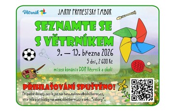Hledáte program na jarní prázdniny pro děti od 7 do 13 let? Tradiční příměstský tábor "Seznamte se s Větrníkem" nabízí pestrý mix aktivit, se kterými se děti setkávají v kroužcích DDM. - 9. - 13. března 2026 - pro děti od 7 do 13 let...