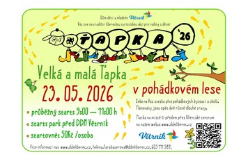 Srdečně Vás zveme na tradiční turistickou akci Velká a malá Ťapka v pohádkovém lese. Startujeme z parku před DDM Větrník v sobotu 23. 5. 2026 od 9:00 do 11:00. (Na trasu se tedy dá vyrazit kdykoliv v tomto časovém rozmezí.)...