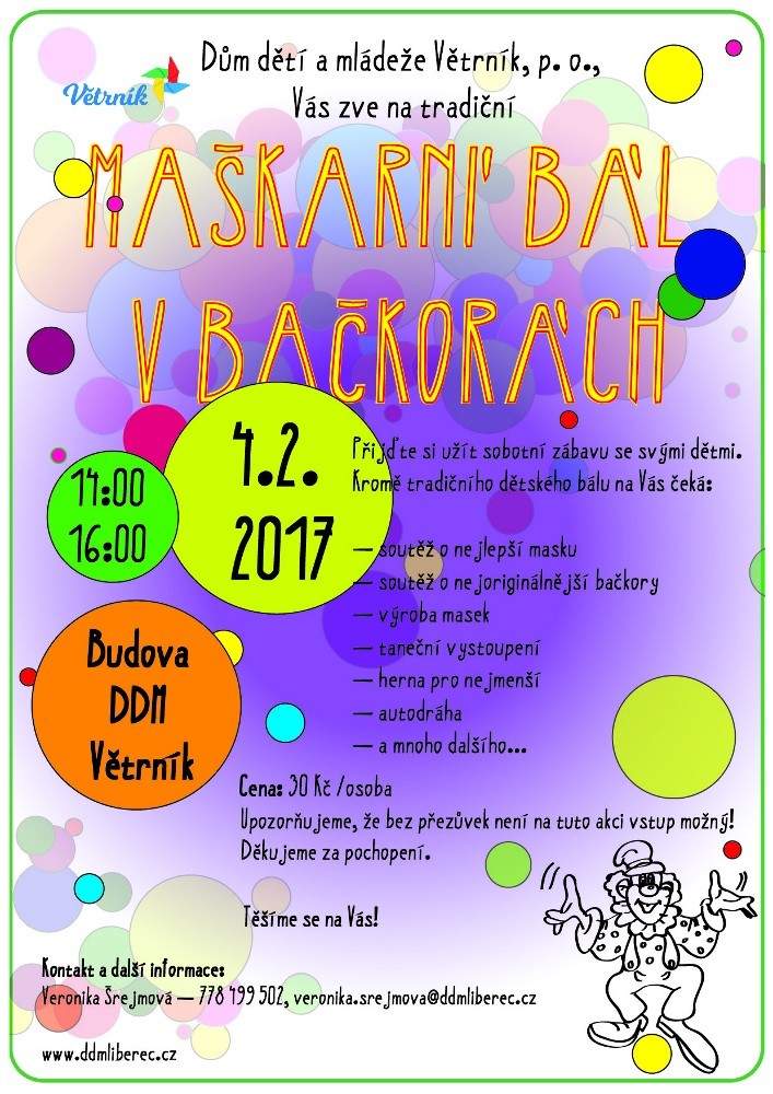 Na sobotu 4. února od 14 hodin si pro Vás DDM Větrník připravil Maškarní bál v bačkorách. Můžete se těšit nejen na soutěž o nejlepší masku a nejoriginálnější bačkory, ale také na tvořivou dílničku zaměřenou na výrobu masek, hernu pro nejmenší, autodráhu, taneční vystoupení a na mnoho dalšího!