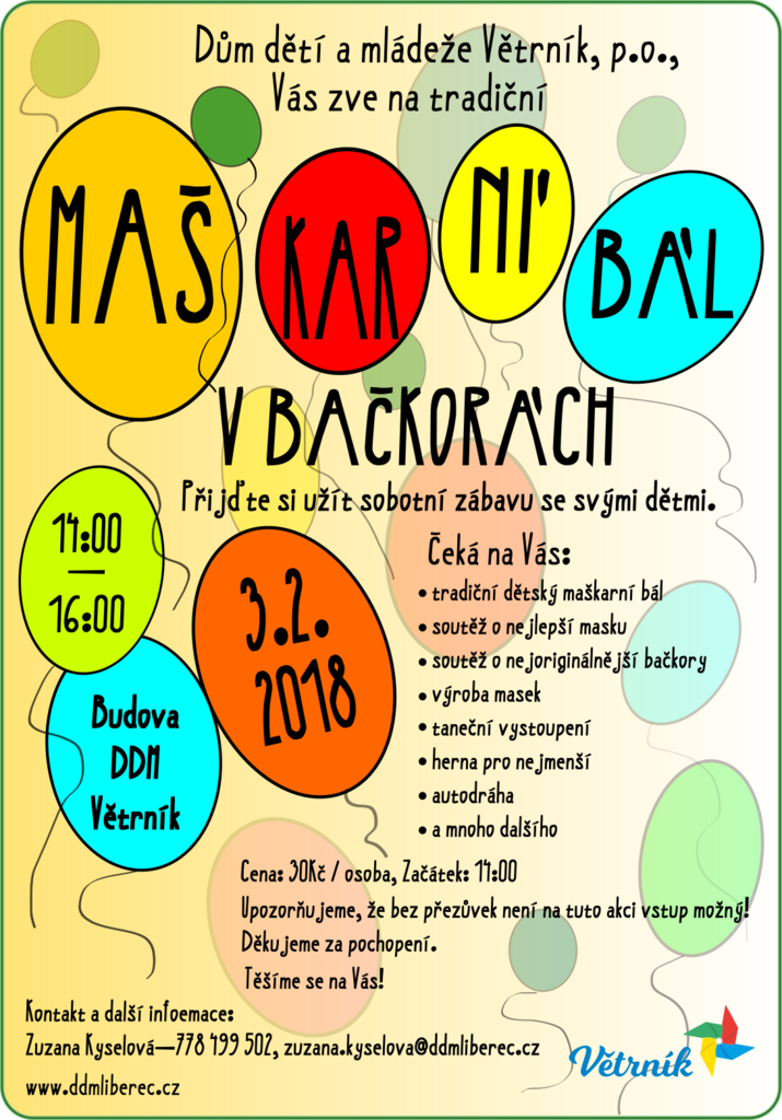 Na sobotu 3. února od 14 hodin si pro Vás DDM Větrník připravil Maškarní bál v bačkorách. Můžete se těšit nejen na soutěž o nejlepší masku a nejoriginálnější bačkory, ale také na tvořivou dílničku zaměřenou na výrobu masek, hernu pro nejmenší, autodráhu, taneční vystoupení a na mnoho dalšího!