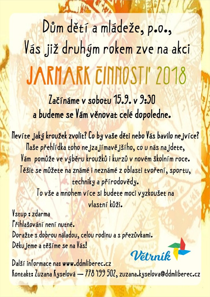Na začátek nového školního roku jsme pro váš připravili novinku - Jarmark činností. Jedná se o přehlídku toho, co DDM Větrník nabízí. Přijďte se k nám v sobotu 15. 9. 2018 podívat. Vaše děti si budou moci vyzkoušet spoustu činností a podle toho se rozhodnout, který kroužek budou v novém školním roce navštěvovat. Začínáme v 9:30 a budeme se vám věnovat celé dopoledne do 12:30.