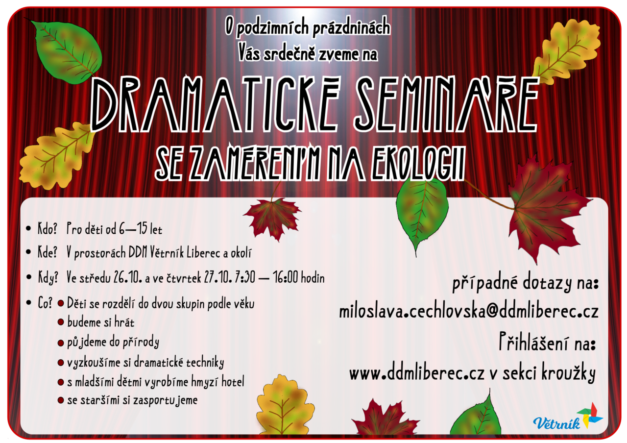 Chcete si o podzimních prázdninách vyzkoušet techniky dramatiky a zároveň se věnovat ekologii? Zážitkový dramatický seminář je určen všem dětem, které si rády hrají, ať už zkušeným dramaťákům, nebo těm, kteří chtějí metody dramatiky vyzkoušet. Tematicky se zaměříme především na ekologii. Na své si přijdou i ti, kteří naše programy znají, počítáme s patřičnými změnami :-) Cílovou skupinou jsou žáci 1. – 9. tříd, děti budou rozděleny do skupin podle věku.
