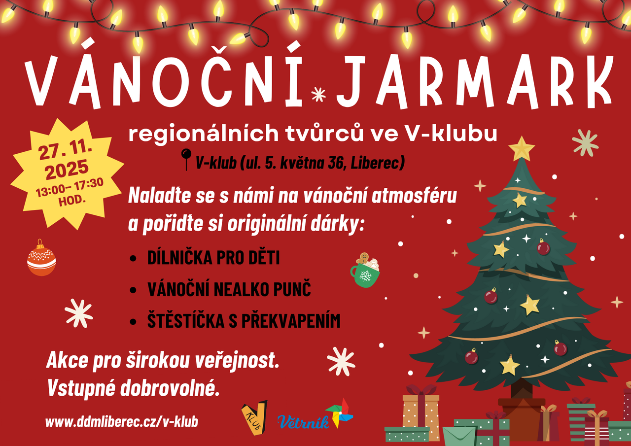 Zveme Vás na tradiční Vánoční jarmark regionálních tvůrců, který se koná ve čtvrtek 27.11. od 13:00 do 17:30 hod. v příjemném prostředí vánočně naladěného V-klubu (5. května 36, Liberec).