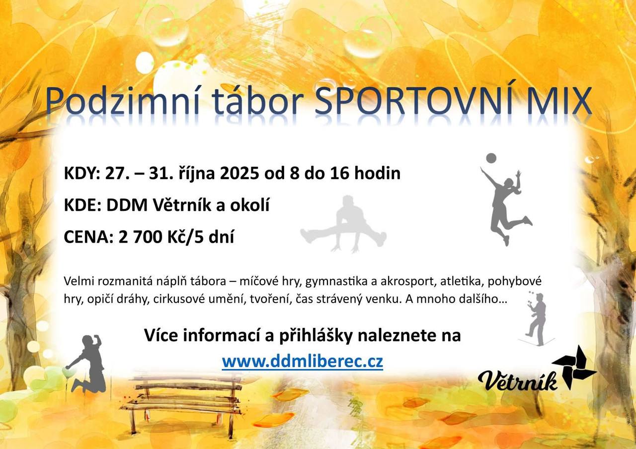 Ve dnech od 27. do 31. října 2025, od 8 do 16 hodin, otevíráme podzimní tábor SPORTOVNÍ MIX - míčové hry, gymnastika a akrosport, atletika, pohybové hry, opičí dráhy, cirkusové umění, tvoření, čas trávený venku a mnoho dalšího...