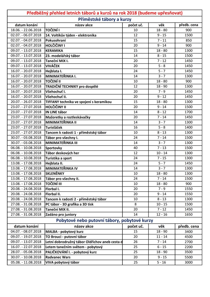 Přinášíme Vám nabídku našich letních táborů a kurzů. Berte tuto nabídku jako provizorní - může se doplňovat a také se mohou měnit některé údaje. Upozorňujeme, že nebudeme reagovat na předběžné rezervace na tábory. Regulérní přihlašování se spustí 1. března a i po této době může docházet k úpravám v seznamech našich táborů. Kliknutím pravým tlačítkem myši na obrázek a výběrem volby "uložit odkaz jako" si seznam můžete uložit na svůj počítač a v klidu prohlédnout. Poslední aktualizace 22. 2. v 10:40.