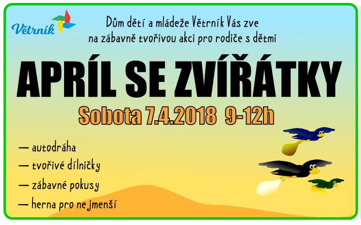 Na sobotu 7. 4. 2018 jsme pro Vás připravili zábavnou dopolední akci pro celou rodinu Apríl se zvířátky. Čekají na Vás tvořivé dílničky, zábavné pokusy, autodráha, herna pro nejmenší a ještě mnoho dalšího. To vše ze světa zvířat.