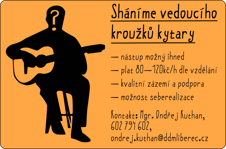 DDM Větrník shání externí vedoucí kroužků kytary. Více informací na přiloženém letáku, nebo u garanta hudebních činností Ondřeje Kuthana (602 794 602, ondrej.kuthan@ddmliberec.cz).