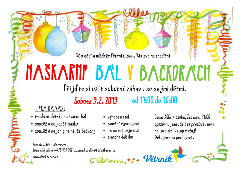 Na sobotu 9. února od 14 hodin si pro Vás DDM Větrník připravil Maškarní bál v bačkorách. Můžete se těšit nejen na soutěž o nejlepší masku a nejoriginálnější bačkory, ale také na tvořivou dílničku zaměřenou na výrobu masek, hernu pro nejmenší, taneční vystoupení a na mnoho dalšího!