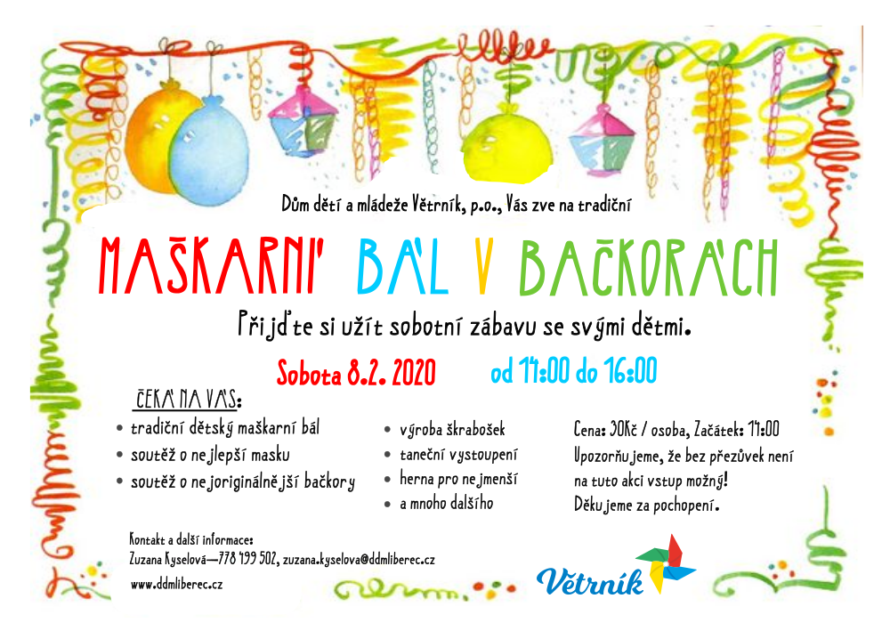 Srdečně Vás zveme na tradiční Maškarní bál v bačkorách, který se koná 08.02. 2020 v prostorách DDM Větrník Liberec.
