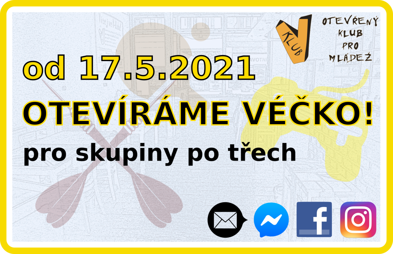 Rozvolnění opatření proti covidu nám umožnilo opět otevřít brány V-klubu v centru Liberce, takže od pondělí 17.5. najíždíme na režim „3 děti naráz“. Na programu jsou např. šipky, herní konzole nintendo, pukec, online hry, fotbálek a další aktivity. Víc info a možnost přihlášení najdete na webu V-klubu http://www.vklub-ddmliberec.cz/ .