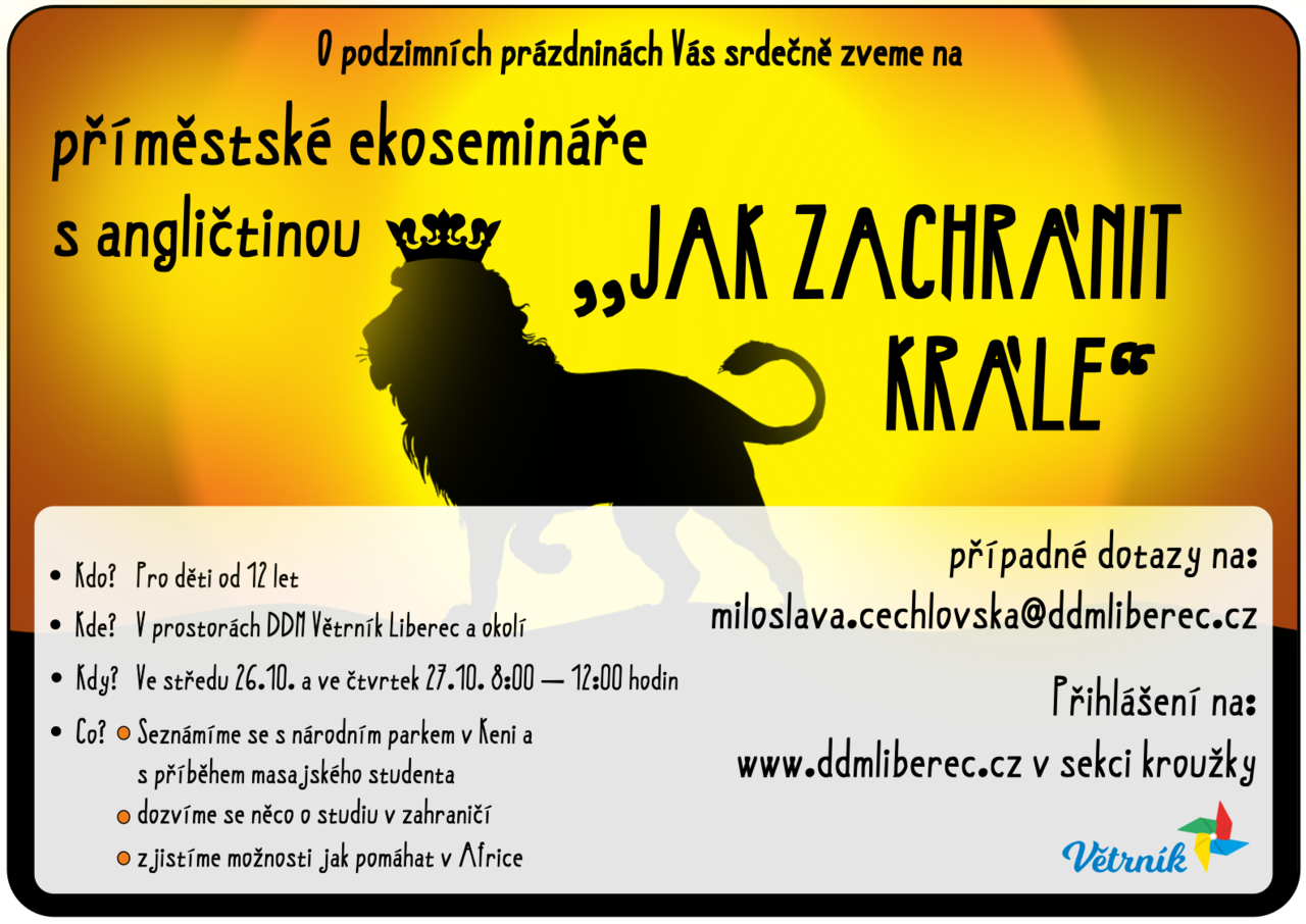 Chcete se o podzimních prázdninách zdokonalit v angličtině a prožít příběh masajského chlapce? Zážitkový seminář je vedený studentkou britské univerzity, původem z Liberce, zabývající se biodiverzitou. Kristýna zmapovala a filmově zdokumentovala reálný příběh mladého keňského Masaje, kterého trápil problém jeho kmene se lvy, likvidujícími v noci stáda krav. Na jedné straně lvi, králové buše ohrožení vyhubením, na druhé straně chudí Masajové, jejichž jedinou obživou stáda jsou. A obyčejný kluk, který našel řešení. Program má za cíl nejen představit jeden z mnoha zdánlivě neřešitelných problémů planety, ale také dát dětem vzor – studentku z Liberce, která se rozhodla vystudovat britskou univerzitu a věnovat život tomu, čemu věří. Program bude částečně veden anglicky. Cílovou skupinou jsou žáci 7. - 9. tříd a studenti středních škol.