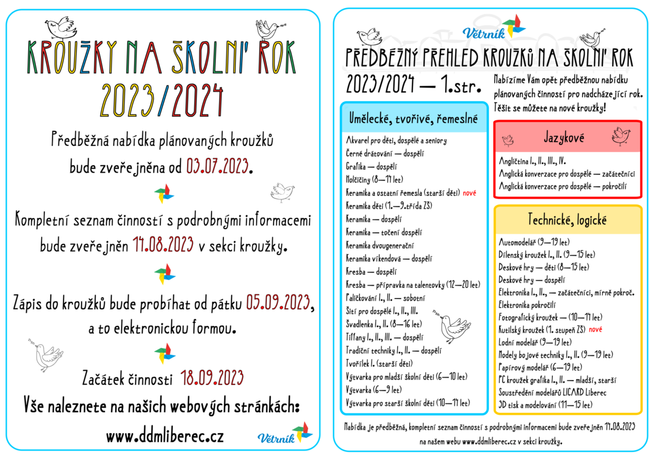 PŘEDBĚŽNÝ PŘEHLED KROUŽKŮ NA NOVÝ ŠKOLNÍ ROK A NOVINKY