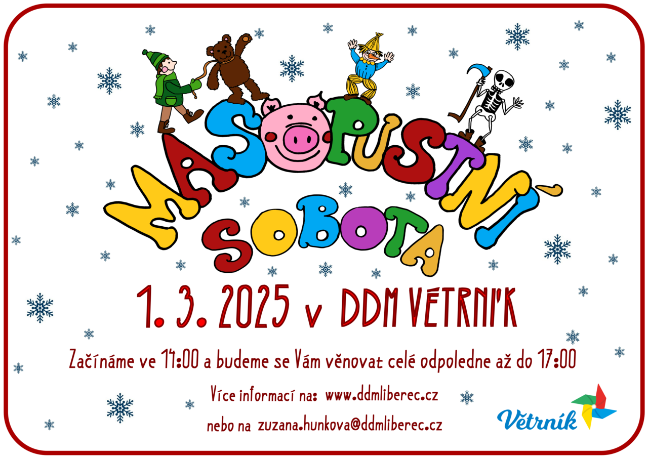 Začínáme 1. 3. 2025 ve 14:00 a budeme se Vám věnovat celé odpoledne až do 17:00 v prostorách DDM Větrník.