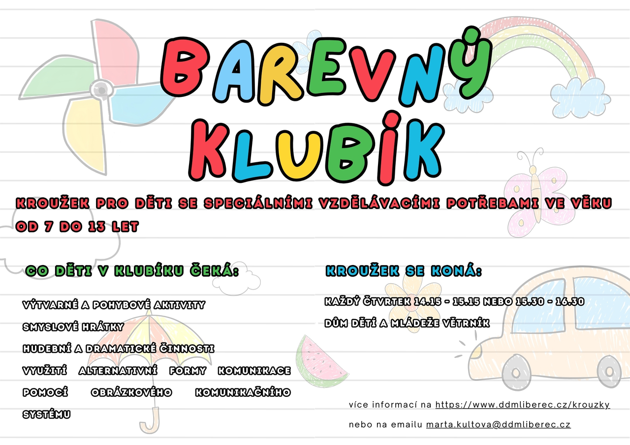 BAREVNÝ KLUBÍK – je nový kroužek pro děti od 7 do 13 let se speciálními vzdělávacími potřebami