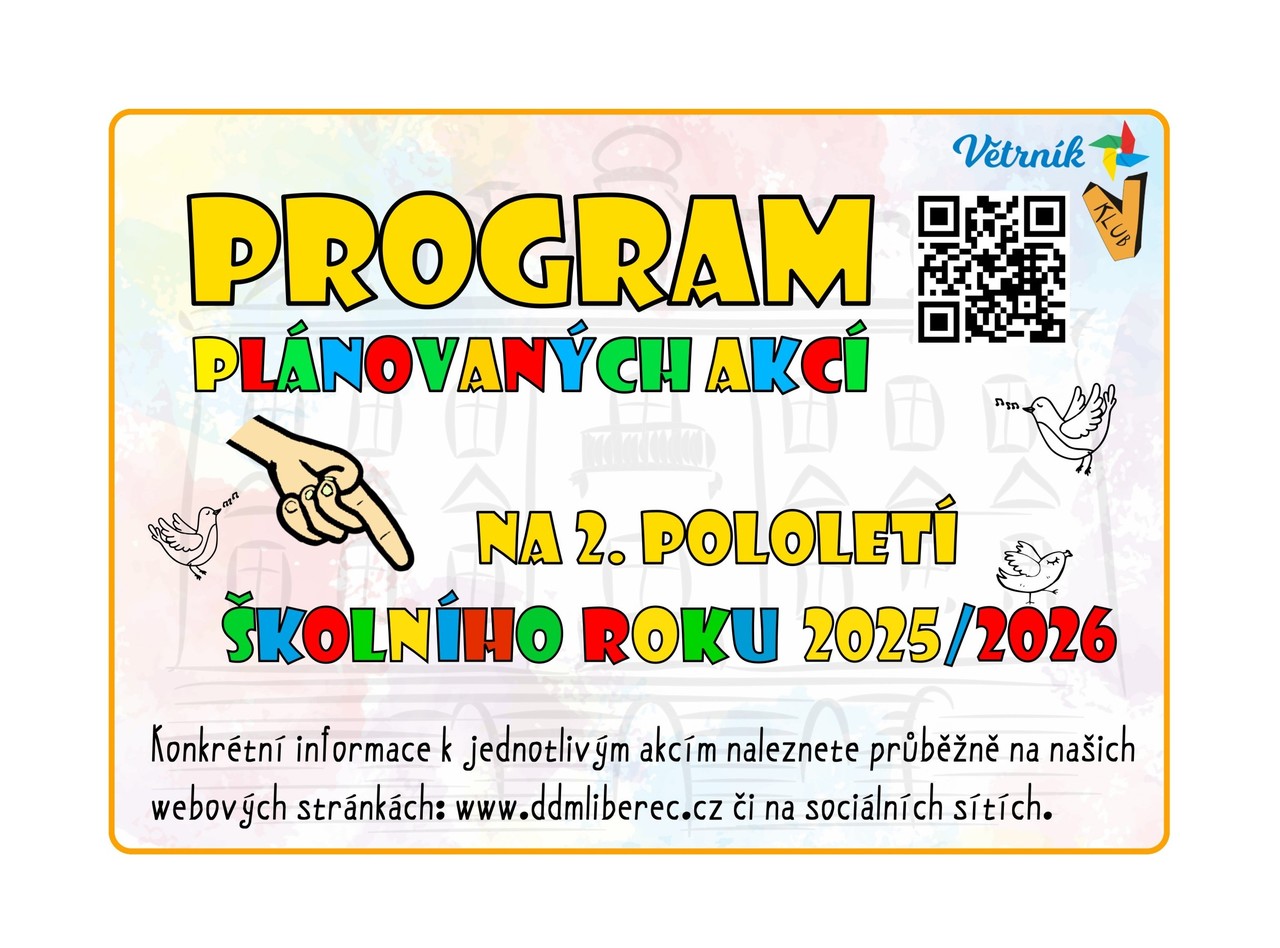 Máme radost, že se s Vámi opět můžeme podělit o program akcí na 2. pololetí školního roku 2025/2026. Inspirujte se a zapište si termíny. Těšíme se na společná setkání.