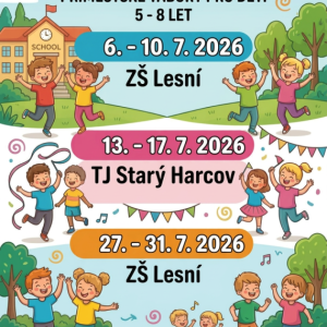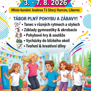 Tábor je zaměřený na pohyb dětí v tělocvičně i venku. Dopoledne budou děti v tělocvičně TJ Harcov, kde budou používat různá náčiní a nářadí: hrazdu, kladinu, kruhy apod., odpoledne budou za hezkého počasí venklu na hrišti, na výletech po okolí, hrát stopovanou a další hry. Za špatného počasí se přesunou do V-klubu (ul. 5.května 36)kde budou hrát hry a tvořit. Sraz dětí je v 8:00 hod. v TJ Harcov, vyzvedávání bude dle počasí (vždy se...