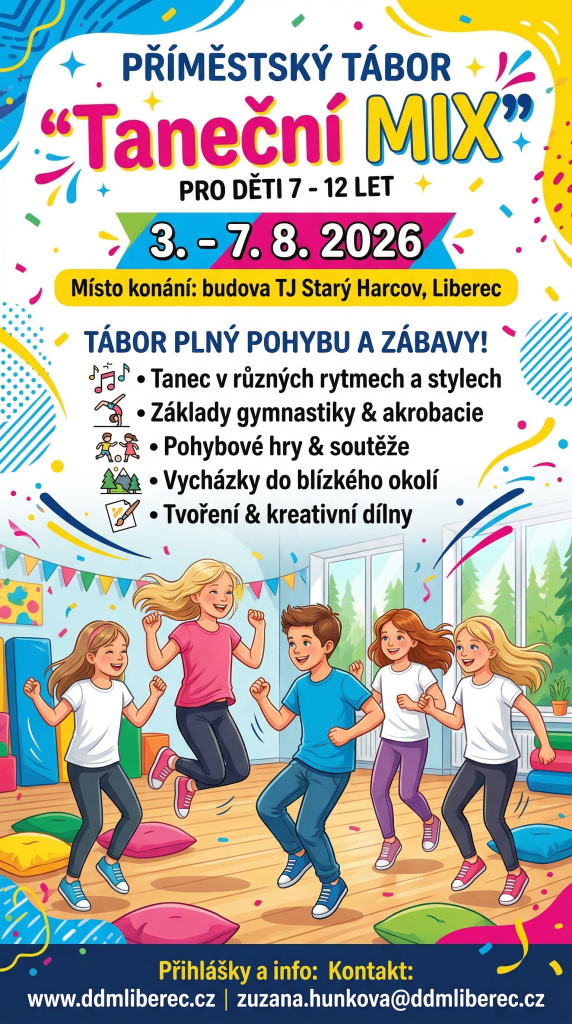 Přemýšlíte, jak zajistit svým dětem prázdninový týden plný tance? Přihlaste je na příměstský tábor „Taneční MIX“, kde se budou dobře bavit, tancovat a získávat nové kamarády!