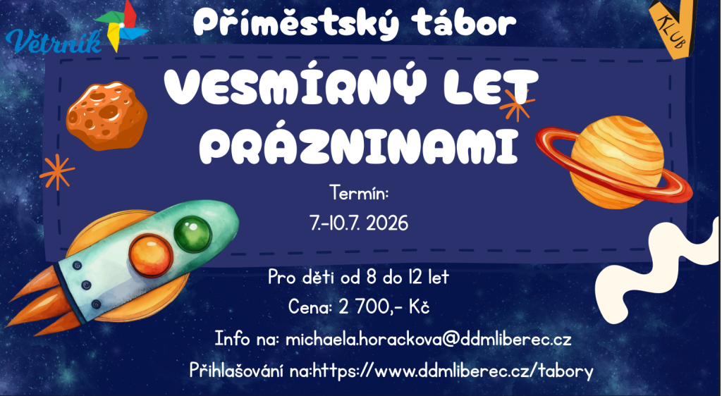 Tábor pro holky i kluky od 8 do 12 let. Budeme cestovat po fiktivních planetách, tvořit z různých materiálů, dělat pokusy, luštit šifry, výletit a hlavně se dobře bavit :-) Navštívíme možná např. Skákací planetu, kde lidé nechodí, ale skáčou, Dřevěnou planetu, kde budeme moct používat a tvořit pouze ze dřeva,... Tábor je inspirovaný seriálem Podivuhodná dobrodružství Vladimíra Smolíka. Tábor probíhá ve V-klubu.